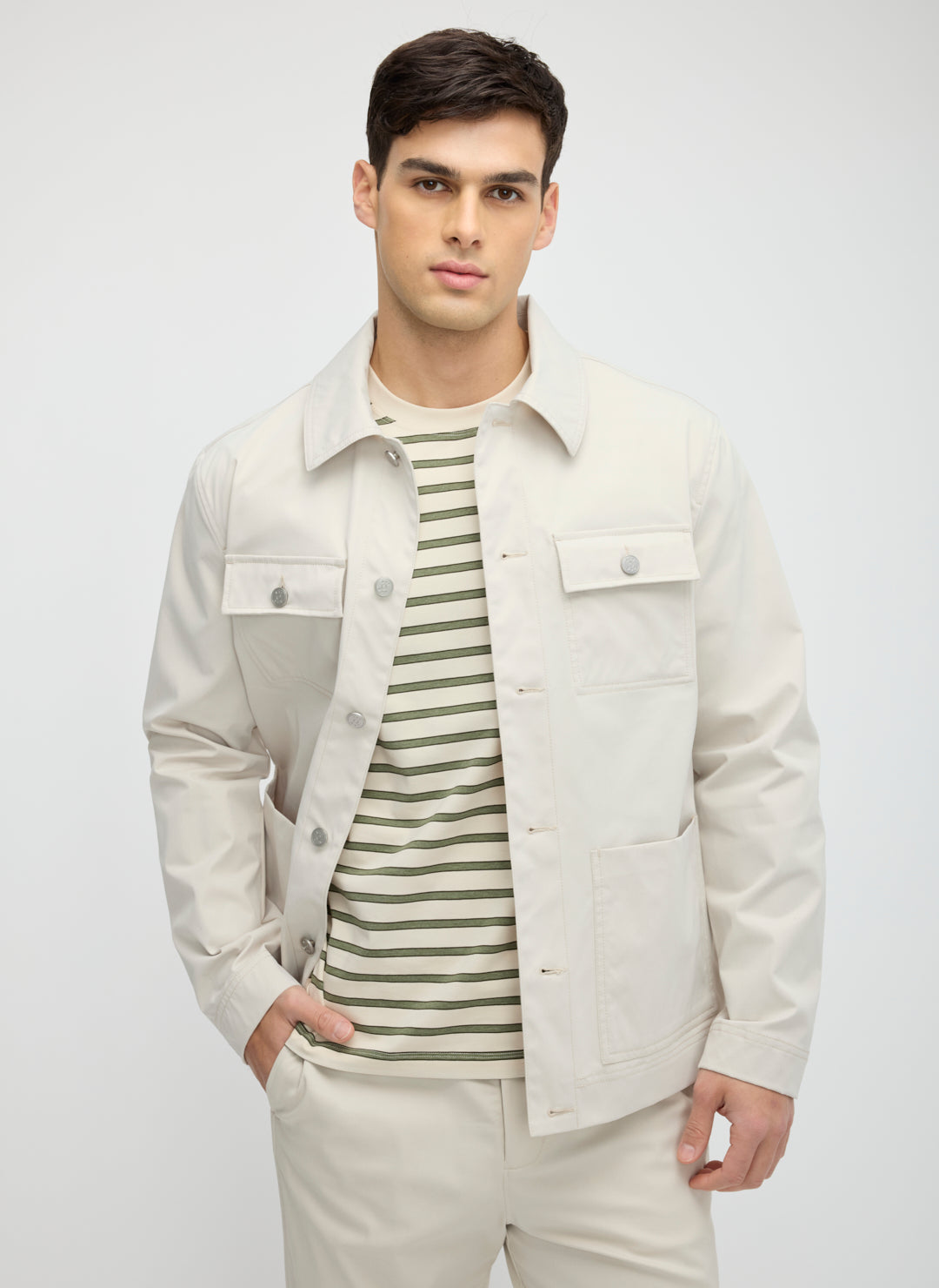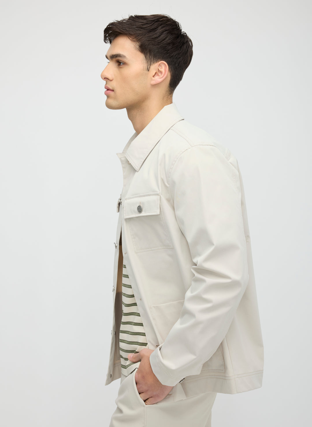 Workwear roots, modern intent. The Regency Chore Jacket is crafted from durable TwillTec with waterproof, fade-resistant performance. A classic fit, metal shank buttons, and structured chest pockets anchor the look, while patch pockets and interior storage bring practical ease. A dependable layer with quiet confidence.