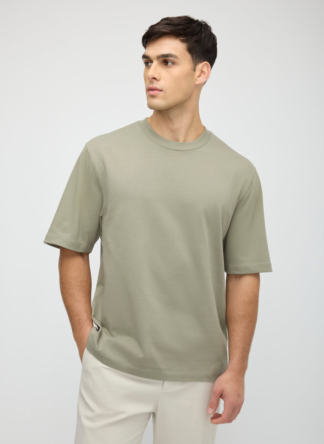 An oversized tee, done right. Crafted from smooth 100% cotton jersey with a soft, weighty feel, it delivers breathable comfort and a drape that holds its shape. The relaxed silhouette, dropped shoulder, and slightly extended sleeve give it easy volume, while clean finishing keeps it sharp. The kind of tee that carries the whole look.