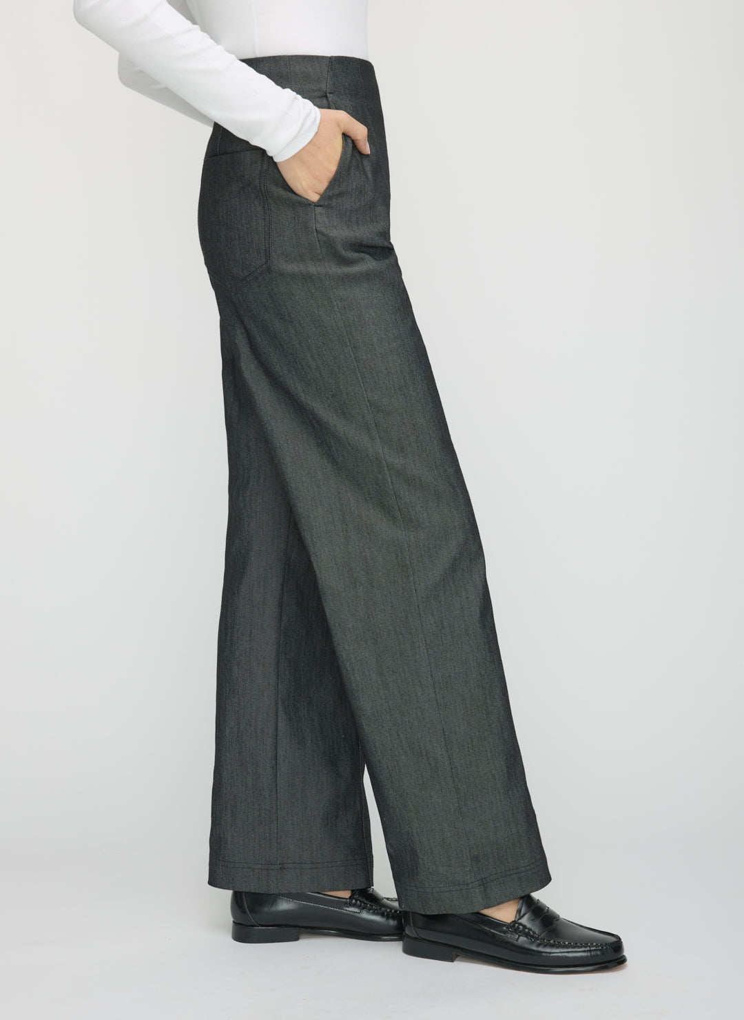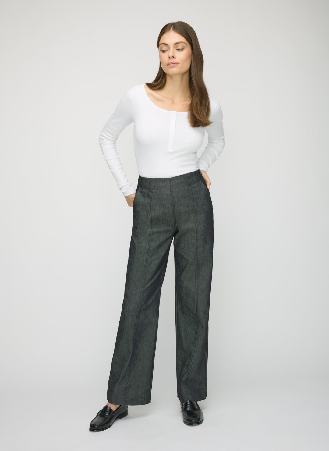 Denim done differently. The Adira Wide Leg Denim Pants are cut from Mod Denim—a soft, non-indigo fabric that won’t bleed but still delivers that classic look and feel. With a high rise, full-length wide leg, and clean waistband, they offer a streamlined take on everyday denim. A side zip closure keeps the fit smooth, while subtle topstitching and back patch pockets finish the look with quiet confidence.