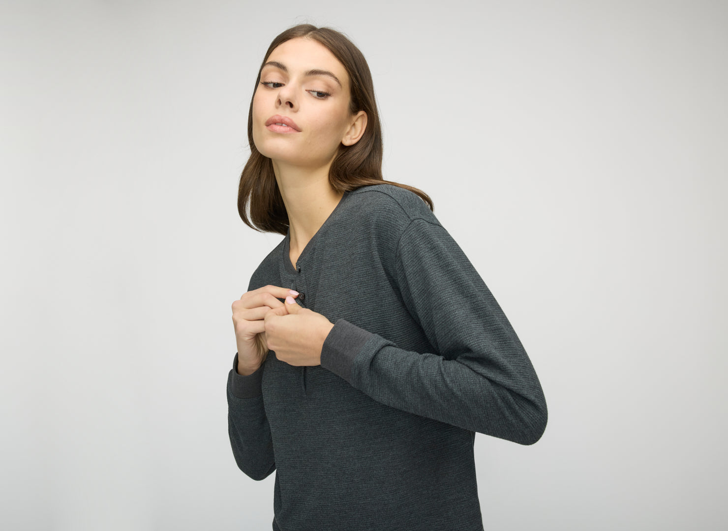 Soft enough to relax, refined enough to go. This matching lounge set elevates downtime with a cropped henley top and slim joggers spun in a soft waffle knit. Ribbed cuffs refine the fit, while pockets add everyday utility. Cozy enough for a night in and polished enough for daytime wear—it’s versatility in its most comfortable form.
