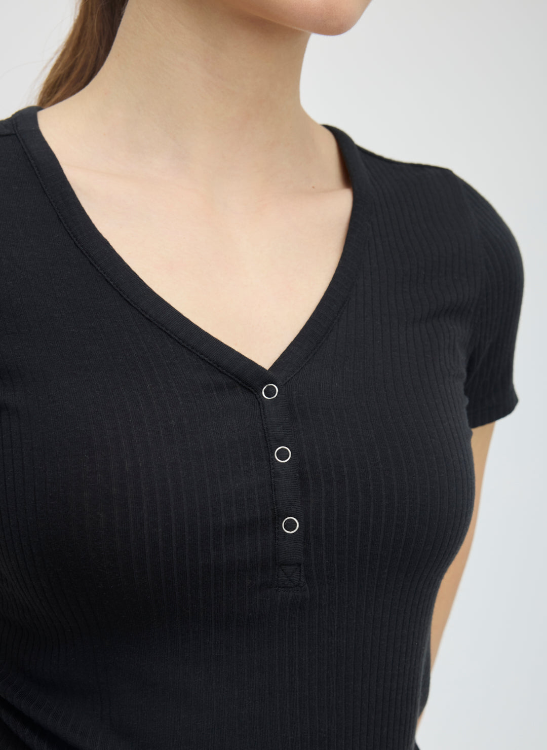 Fitted tee with snap-front Henley neckline.