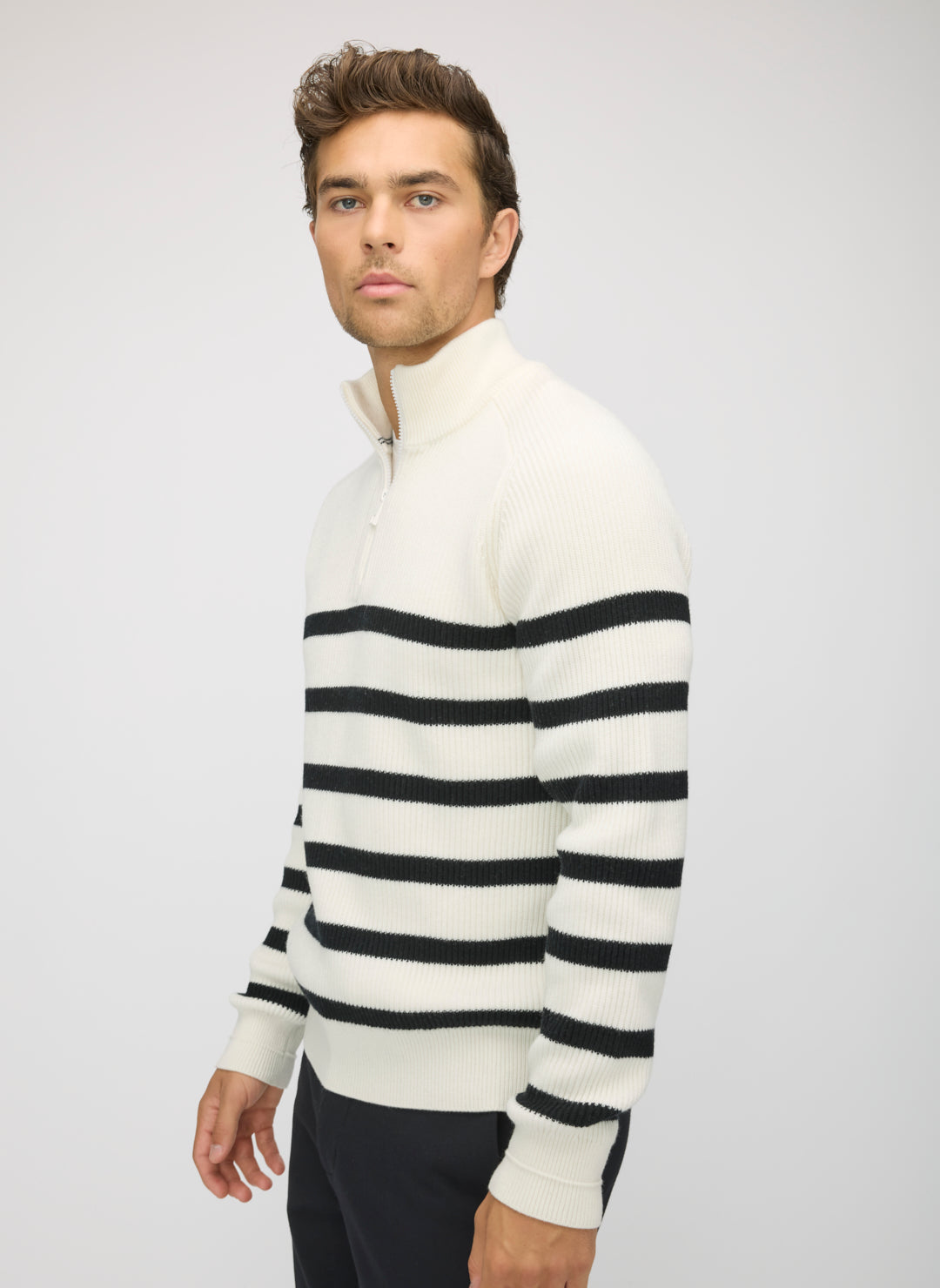 A warm, versatile saddle-sleeve pullover that pairs nicely with cool temperatures and a busy schedule. Crafted from a luxurious blend of Merino cotton and extra fine Merino wool, this classic sweater is naturally soft, breathable, and temperature-regulating. Finished with a sleek high neck and quarter zip for adjustable ventilation, it proves cozy doesn’t have to compromise on style.
