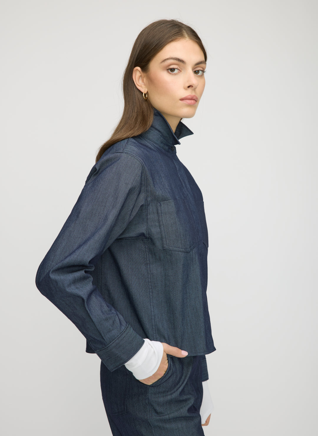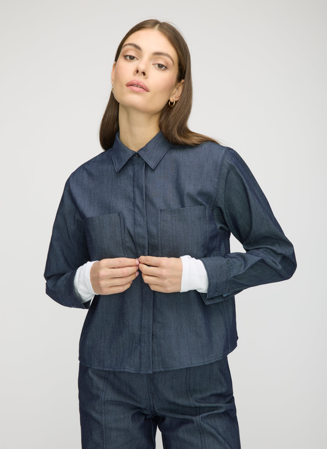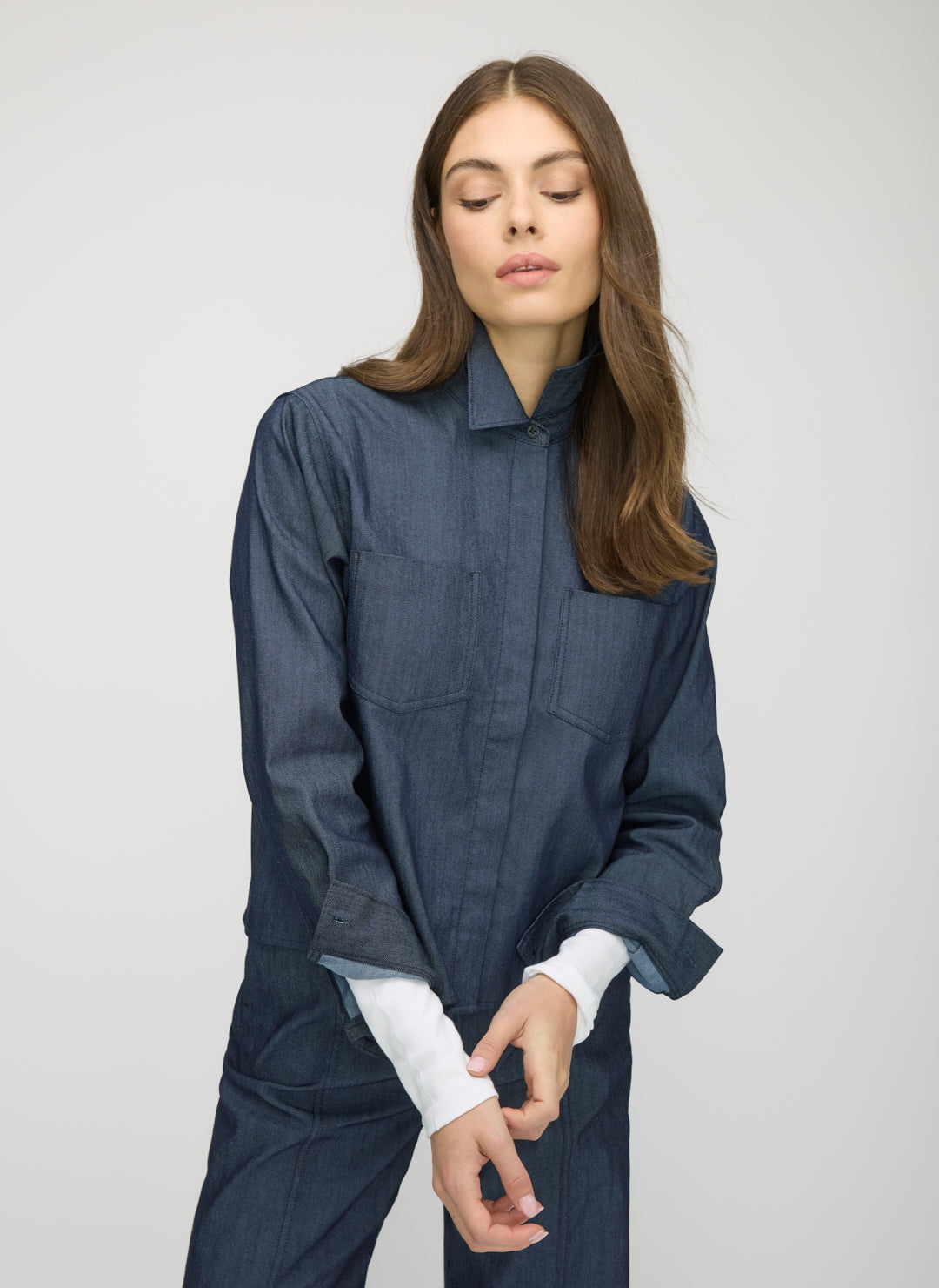 The modern denim essential. The Adira Denim Shirt is a classic button-up reimagined in MOD Denim—a soft, durable fabric with just the right amount of structure. Cut in a relaxed fit with a high-hip length, it features a hidden front placket, lined patch pockets, and buttoned cuffs with vent details. Versatile enough for layering or wearing solo, it’s a year-round staple and your shortcut to endless effortless outfits.