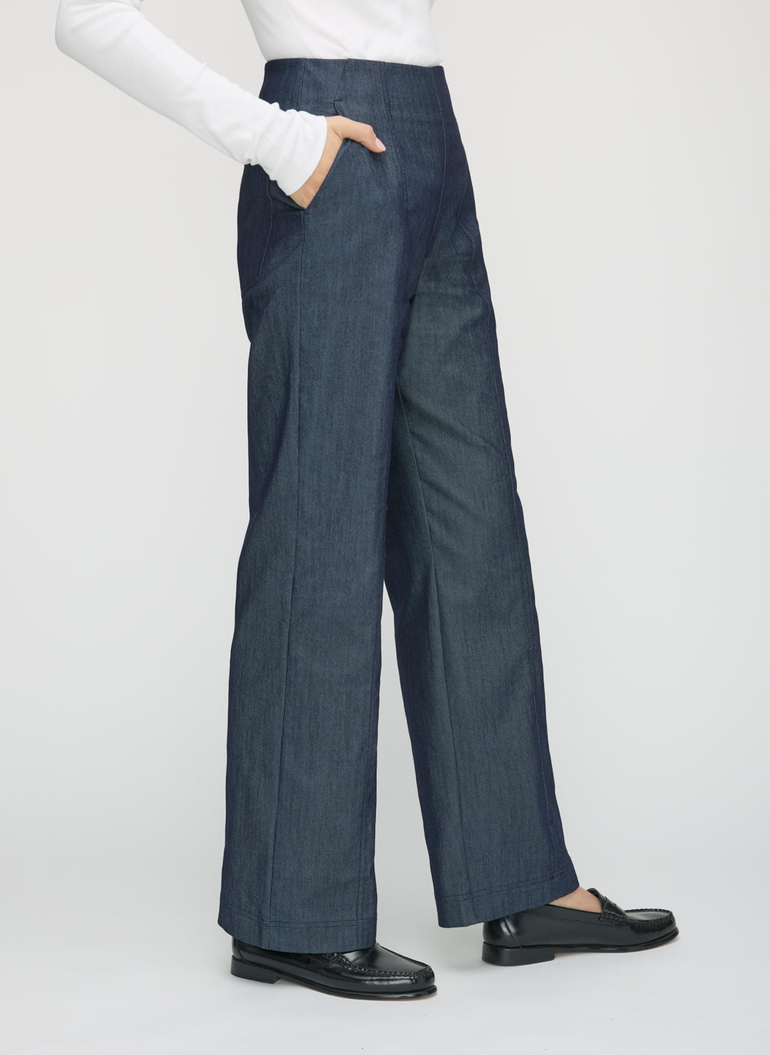 Denim done differently. The Adira Wide Leg Denim Pants are cut from Mod Denim—a soft, non-indigo fabric that won’t bleed but still delivers that classic look and feel. With a high rise, full-length wide leg, and clean waistband, they offer a streamlined take on everyday denim. A side zip closure keeps the fit smooth, while subtle topstitching and back patch pockets finish the look with quiet confidence.