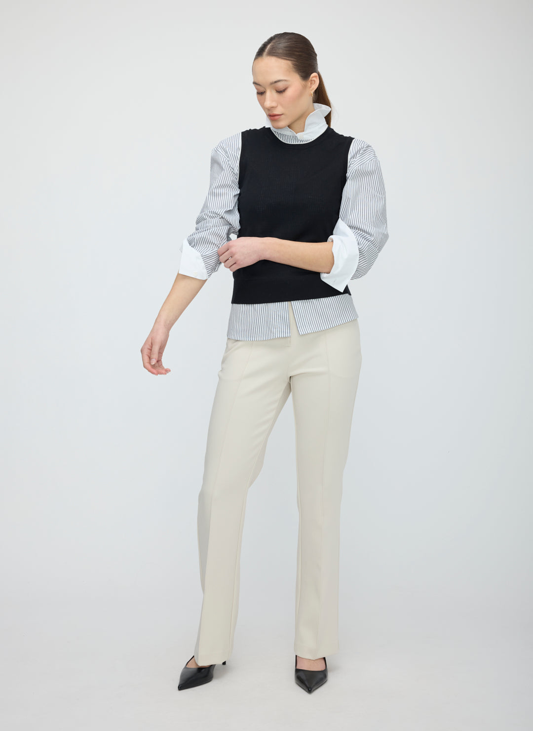 High-rise waist with flared leg and pintuck seam.
