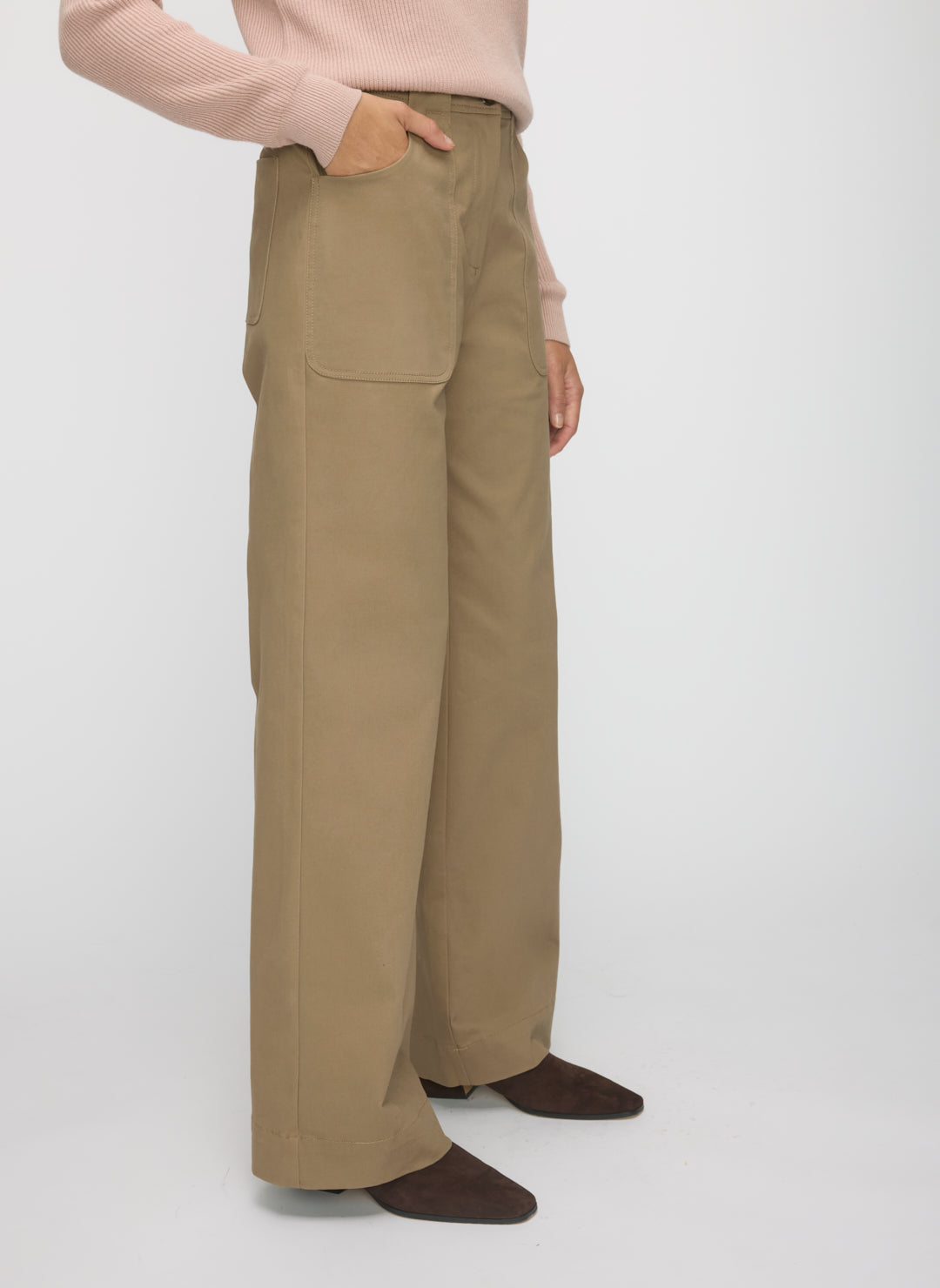 Pants that work as hard as you. The Colette Wide Leg Twill Pants are cut high at the waist and fall into a wide, full-length leg for modern ease. Crafted in brushed stretch twill, they balance durability with comfort, while patch pockets and a fly front add subtle utility. A pant built for the office, weekends, and everywhere in between.