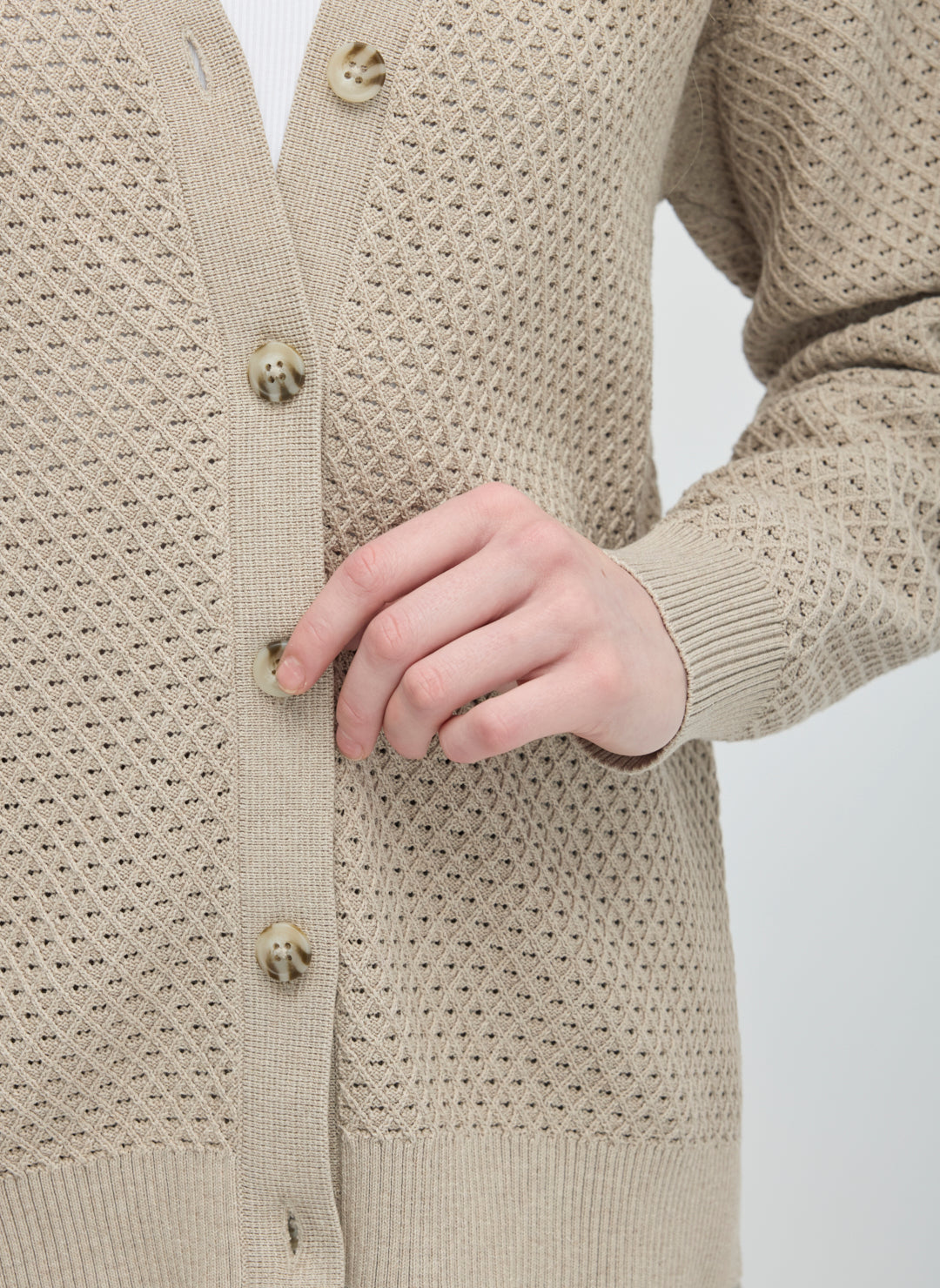 An easy layer, with a little more texture. This Cardigan brings a relaxed, oversized fit together with a lightweight cotton-silk knit that feels soft, breathable, and easy to wear. The open stitch adds dimension without weight, making throw-on-and-go simplicity feel a little more elevated.